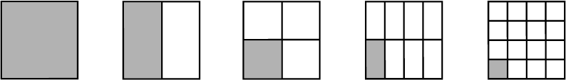 1. Take a sheet of paper. Fold it as shown in the figure. Count the number of parts and the area of a part in each case.