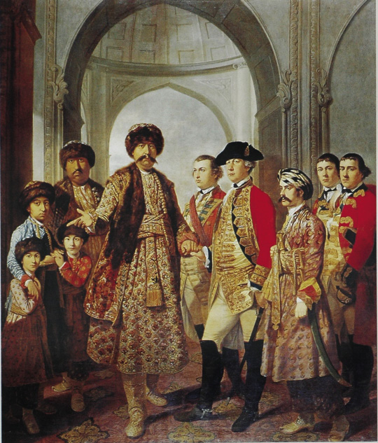 Fig. 7 – Nawab Shujauddaulah of Awadh, with his sons and the British Resident, painted by Tilly Kettle (oil, 1772)