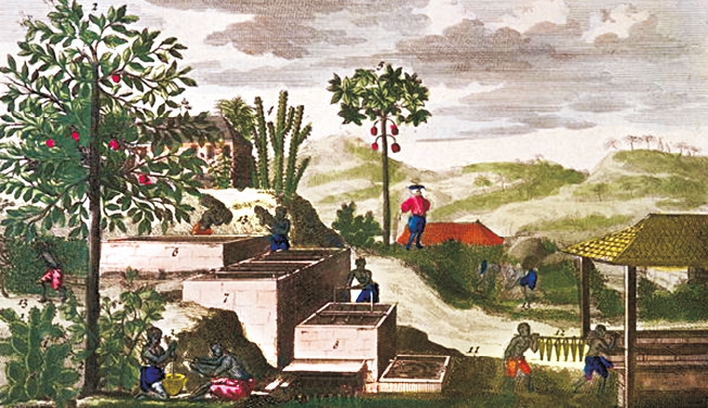 चित्र 14 - कैरिबियाई द्वीप समूह स्थित बाग़ानों में नील का उत्पादन।
