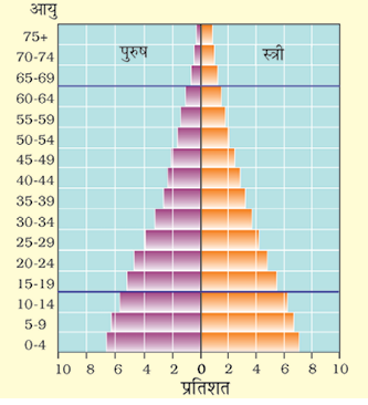 जिन देशों में मृत्यु दर (विशेष रूप से बहुत छोटे बच्चों में) कम हो रही है, युवा आयु वर्ग का पिरामिड चौड़ा है क्याेंकि शिशु प्रौढ़ावस्था तक जीवित रहते हैं। यह भारत के पिरामिड में दृष्टिगोचर होता है (चित्र 6.8)। इस प्रकार की जनसंख्या में युवा सापेक्षत: अधिक हैं इसका अर्थ मज़बूत और वर्धमान बढ़ती हुई श्रम शक्ति है।