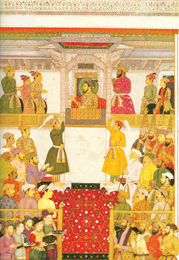Fig.14 – Europeans bringing gifts to Shah Jehan, Agra, 1633, from the Padshahnama. Notice the European visitors’ hats at the bottom of the picture, creating a contrast with the turbans of the courtiers.