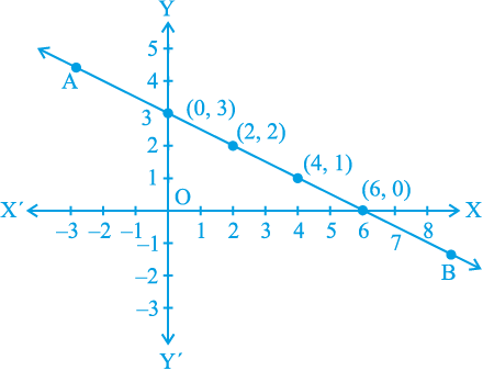पिछले अध्याय में आपने यह देखा है कि एक आलेख कागज (graph paper) पर बिंदुओं को किस प्रकार आलेखित किया जाता है। आइए हम आलेख कागज पर बिंदुओं (0, 3), (2, 2), (4, 1) और (6, 0) को आलेखित करें। अब किन्हीं दो बिंदुओं को मिलाकर एक रेखा प्राप्त कीजिए। मान लीजिए यह रेखा AB है