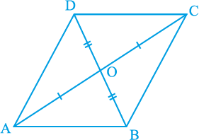 समांतर चतुर्भुज का एक गुण और भी है। आइए इसका अध्ययन करें। एक समांतर चतुर्भुज ABCD खींचिए और उसके दोनों विकर्ण AC और BD खींचिए, जो परस्पर O पर प्रतिच्छेद करते हैं (देखिए आकृति 8.10)।
