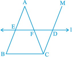आकृति 8.26 में देखिए कि भुजा AB का मध्य-बिंदु E है और E से होकर जाने वाली रेखा l भुजा BC के समांतर है। साथ ही, CM || BA है।