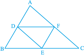 प्रमेय 8.9 : किसी त्रिभुज की किन्ही दो भुजाओं के मध्य-बिंदुओं को मिलाने वाला रेखाखंड तीसरी भुजा के समांतर होता है।