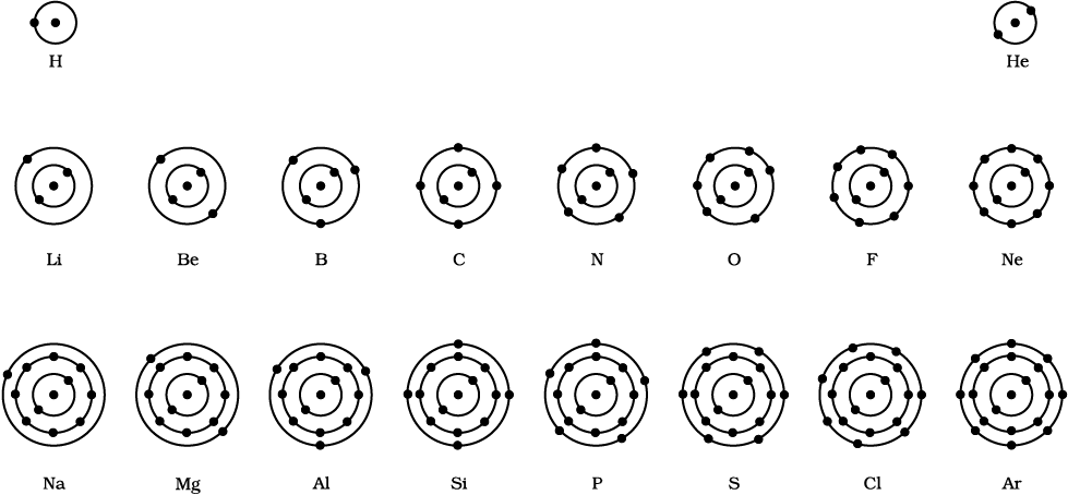 पहले 18 तत्वों की परमाणु संरचना के व्यवस्था चित्र को चित्र 4.4 में दिखाया गया है।