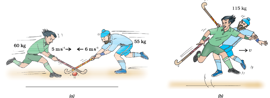 चित्र 9.19: दो हॉकी खिलाड़ियों की टक्कर: (a) टक्कर से पहले तथा (b) टक्कर के पश्चात्