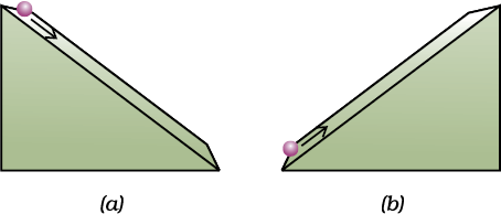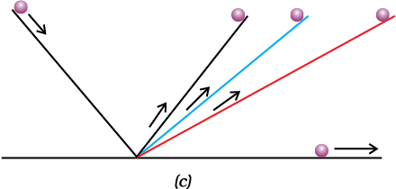 चित्र 9.5: (a) किसी काँच की गोली का आनत तल पर नीचे की ओर लुढ़कना; (b) गोली की ऊपर की ओर गति; तथा (c) काँच की गोली की द्वि-आनत तल पर गति