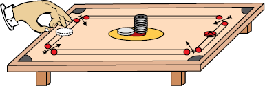 चित्र 9.6: किसी तीव्र गति की कैरम की गोटी (या स्ट्राइकर) से टकरा कर ढेरी के सबसे नीचे वाली गोटी ही ढेरी से बाहर आती है।