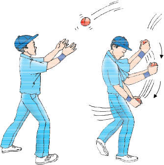 चित्र 9.8: क्रिकेट के खेल में कैच लपकने के लिए क्षेत्ररक्षक गेंद के साथ अपने हाथों को धीरे-धीरे पीछे की ओर खींचता है।