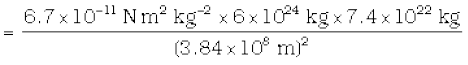 उदाहरण 10-1 पृथ्वी का द्रव्यमान 6 × 1024 kg है तथा चंद्रमा का द्रव्यमान 7.4 × 1022 kg है। यदि पृथ्वी तथा चंद्रमा के बीच की दूरी 3.84 × 105 km है तो पृथ्वी द्वारा चंद्रमा पर लगाए गए बल का परिकलन कीजिए।