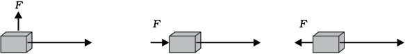 18. निम्न में से प्रत्येक स्थिति में m द्रव्यमान के एक पिंड पर एक बल F लग रहा है। विस्थापन की दिशा पश्चिम से पूर्व की ओर है जो एक लंबे तीर से प्रदर्शित की गई है। चित्रों को ध्यानपूर्वक देखिए और बताइए कि किया गया कार्य ऋणात्मक है, धनात्मक है या शून्य है।