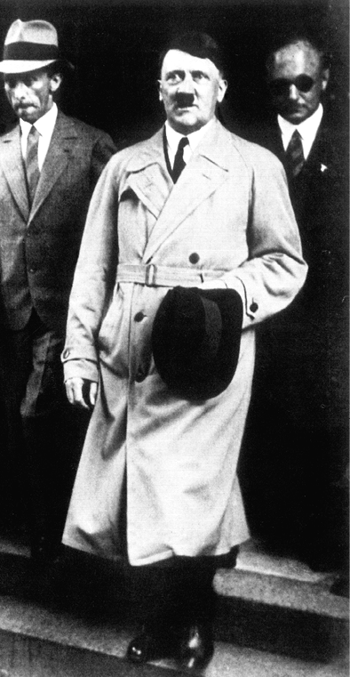 चित्र 1 - हिटलर (मध्य) और ग्योबल्स (बाएँ) सरकारी बैठक के बाद बाहर निकलते हुए, 1932.