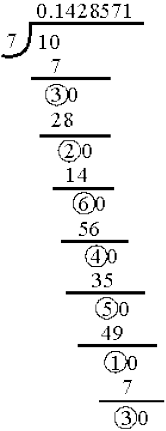 will not have a terminating decimal expansion. Hence, 0 will not show up as a remainder (Why?), and the remainders will start repeating after a certain stage. So, we will have a block of digits, namely, 142857, repeating in the quotient of