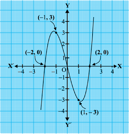We see from the table above that – 2, 0 and 2 are zeroes of the cubic polynomial x3 – 4x. Observe that –2, 0 and 2 are, in fact, the x-coordinates of the only points where the graph of y = x3 – 4x intersects the x-axis. Since the curve meets the x-axis in only these 3 points, their x-coordinates are the only zeroes of the polynomial.
