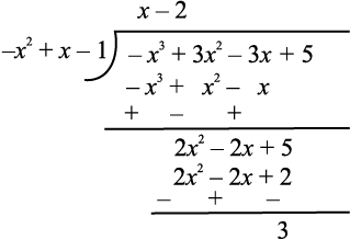 We stop here since degree (3) = 0 < 2 = degree (–x2 + x – 1). So, quotient = x – 2, remainder = 3.