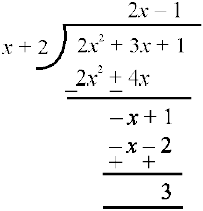 Note that we stop the division process when either the remainder is zero or its degree is less than the degree of the divisor. So, here the quotient is 2x – 1 and the remainder is 3. Also, (2x – 1)(x + 2) + 3 = 2x2 + 3x – 2 + 3 = 2x2 + 3x + 1 i.e., 2x2 + 3x + 1 = (x + 2)(2x – 1) + 3