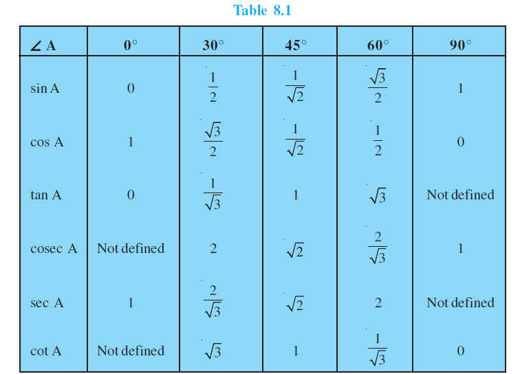 4. The values of trigonometric ratios for angles 0°, 30°, 45°, 60° and 90°.
