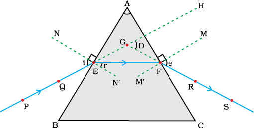 प्रिज़्म के अपवर्तक पृष्ठों AB तथा AC पर क्रमशः बिंदुओं E तथा F पर अभिलंब खींचिए।