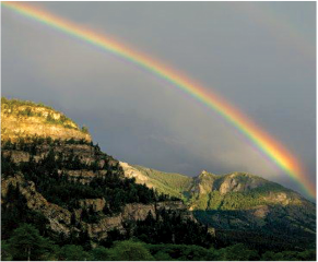 इंद्रधनुष, वर्षा के पश्चात आकाश में जल के सूक्ष्म कणों में दिखाई देने वाला प्राकृतिक स्पेक्ट्रम है (चित्र 11.7)। यह वायुमंडल में उपस्थित जल की सूक्ष्म बूँदों द्वारा सूर्य के प्रकाश के परिक्षेपण के कारण प्राप्त होता है। इंद्रधनुष सदैव सूर्य के विपरीत दिशा में बनता है। जल की सूक्ष्म बूँदें छोटे प्रिज़्मों की भाँति कार्य करती हैं। सूर्य के आपतित प्रकाश को ये बूँदें अपवर्तित तथा विक्षेपित करती हैं, तत्पश्चात इसे आंतरिक परावर्तित करती हैं, अंततः जल की बूँद से बाहर निकलते समय प्रकाश को पुनः अपवर्तित करती हैं (चित्र 11.8)। प्रकाश के परिक्षेपण तथा आंतरिक परावर्तन के कारण विभिन्न वर्ण प्रेक्षक के नेत्रों तक पहुँचते हैं।