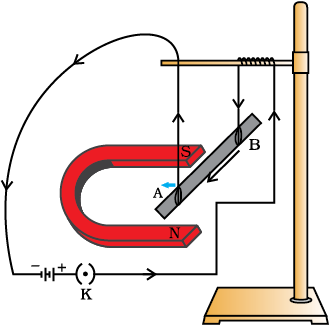 कुंजी लगाकर परिपथ बंद कीजिए ताकि ताँबे के तार से विद्युत धारा प्रवाहित हो। यह सुनिश्चित कीजिए कि बिंदुओं X तथा Y के बीच में लगा ताँबे का तार ऊर्ध्वाधरतः सीधा रहे।