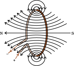 जब दो वलयों से जुड़ी धुरी को इस प्रकार घुमाया जाता है कि कुंडली की भुजा AB ऊपर की ओर (तथा भुजा CD नीचे की ओर), स्थायी चुंबक द्वारा उत्पन्न चुंबकीय क्षेत्र में, गति करती है तो कुंडली चुंबकीय क्षेत्र रेखाओं को काटती है। मान लीजिए कुंडली ABCD को चित्र 13.19 में दर्शायी व्यवस्था में, दक्षिणावर्त घुमाया जाता है। तब फ्लेमिंग का दक्षिण-हस्त नियम लागू करने पर इन भुजाओं में AB तथा CD दिशाओं के अनुदिश प्रेरित विद्युत धाराएँ प्रवाहित होने लगती हैं। इस प्रकार, कुंडली में ABCD दिशा में प्रेरित विद्युत धारा प्रवाहित होती है। यदि कुंडली में फेरों की संख्या अत्यधिक है तो प्रत्येक फेरे में उत्पन्न प्रेरित विद्युत धारा परस्पर संकलित होकर कुंडली में एक शक्तिशाली विद्युत धारा का निर्माण करती है। इसका तात्पर्य यह है कि बाह्य परिपथ में B2 से B1 की दिशा में विद्युत धारा प्रवाहित होती है।