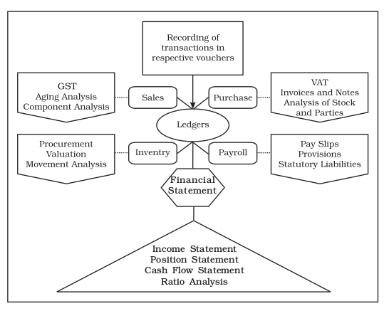Accounting software may be structured with such components as provide for storage and processing of data pertaining to purchase, sales, inventory, payroll and other financial transactions (refer figure 12.2).