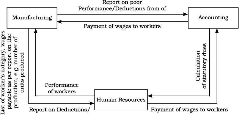 The manufacturing department receives the list of workers from the Human Resource (HR) department. It sends the details of production achieved by the workers on the basis of which the HR department to the finance and accounts (F&A) department to pay the wages. The details of the wages paid and statutory dues are also send by the F & A department to the production department also to the HR department to monitor the performance of workers. The HR department communicates to the other departments about the good/bad performance on the basis decision on various operational matters may be taken.