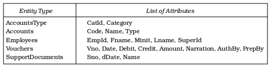 Anything in the real world with independent existence is called entity such as an object with physical existence (e.g. car, person, house) or conceptual existence (e.g. a company, job, university course, account, voucher). In the context of above accounting reality, there exist five entities: Accounts, Vouchers, Employees, AccountsType and SupportDocuments. The accounting data is captured through these entities.