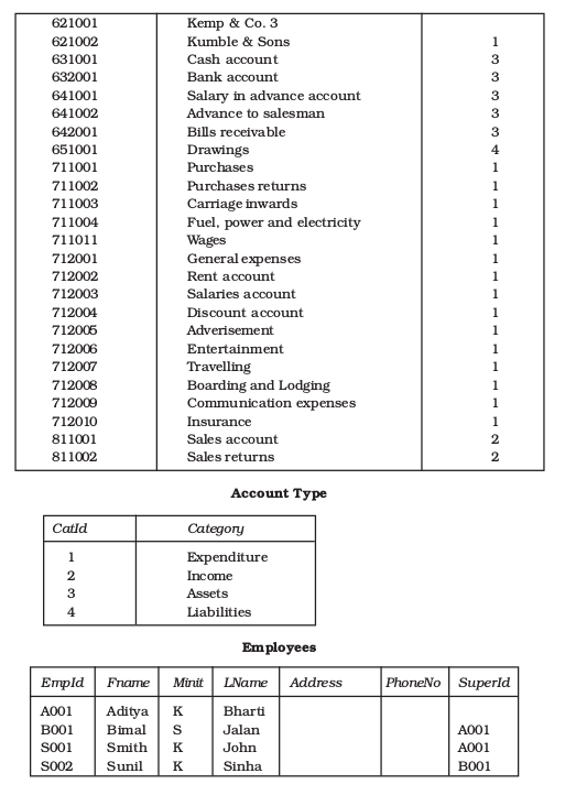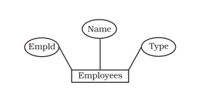 Employees is a physical entity that is meant to express the various employees who are in some way connected with the accounting system. The EmpId (Employee ID) attribute is meant to identify an Employee; Fname, Minit and Lname are respectively the first, middle and Last names of an employee; and SuperId refers to EmpId of the immediate boss of an employee.