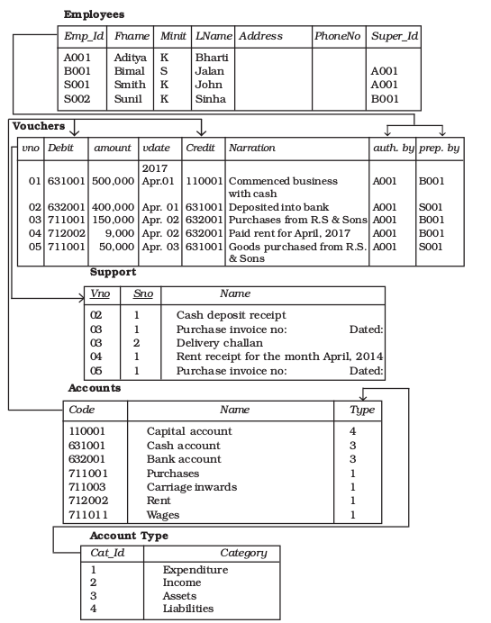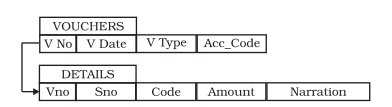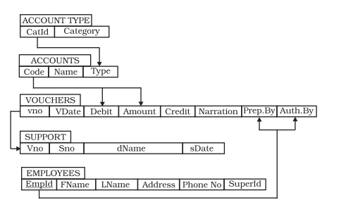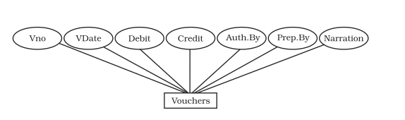Relationship among two or more entity types represents an interaction among their respective entities. Whenever an attribute (say Debit) of one entity type (say vouchers) refers to another entity type (say Accounts), there exists a relationship between these entities (Vouchers and Account).