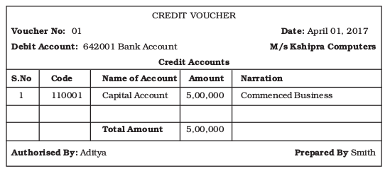 On April 01, 2017 M/s Kshipra Computers commences business with initial capital of Rs.5,00,000, which is deposited into bank. Recall the journal entry that is recorded using manual accounting system. This journal entry has data contents that are filled-up using a simple transaction voucher, which is prepared by Smith and authorised by Aditya.
