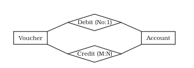 For example, vouchers and accounts are related in two ways: vouchers contain debit account(s) and vouchers contain credit account(s). In ER Model, these references are represented as explicit relationships rather than attributes.