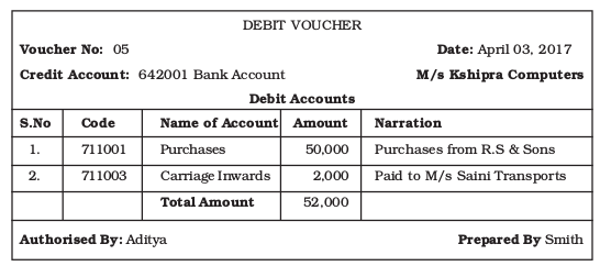 On April 03-2017 M/s Kshipra Computers bought goods costing Rs.50,000 from M/s R.S. and Sons, paying Rs.2,000 as cartage to M/s Saini Transports. This transaction involves multiple debits of accounts with one account being credited. The debit voucher that is used to document this transaction appears as follows :
