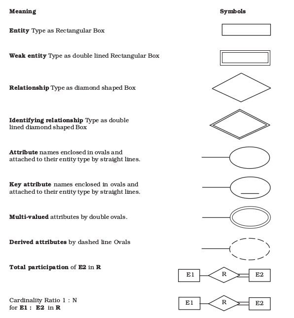 It is a popular conceptual data model, which is mostly used in database-oriented applications. The major elements of ER Model are entities, attributes, identifiers and relationships that are used to express a reality for which a database is to be designed. The model is best depicted with the help of ER symbols, the list and description of which is shown in figure 14.5. While preparing an ER Diagram, the following symbols are used to represent different types of entities, attributes, identifiers and relationships :