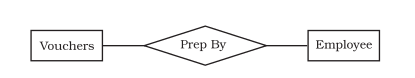 (i) Types of relationships : Whenever entities from different entity types are related to one another in a particular manner, they constitute a relationship type. The relationship prepared by between the two entity types vouchers and employees associates each voucher with the employee who prepared it. Similarly, the relationship authorised by between the two entity types vouchers and employees associates each voucher with the employee who authorises it. Each relationship instance of prepared by (short named as PrepBy) associates one voucher entity with one employee entity. In ER diagrams, relationship types are displayed as diamond shaped boxes, connected by straight lines to the rectangular boxes, which represent the participating entity types.