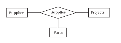 (ii) Degree : The degree of a relationship type is the number of participating entity types. A relationship type of degree two is called binary and that of degree three is called ternary. A VOUCHER (entity), Authorised_by (relationship) and EMPLOYEES (entity) together signify a binary relationship. A SUPPLIER (entity) SUPPLY (relationship) PARTS (entity) to PROJECT (entity) signify a ternary relationship because three entities, namely supplier, parts and projects are participating in supply relationship in any transaction.