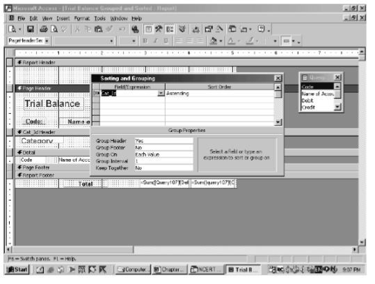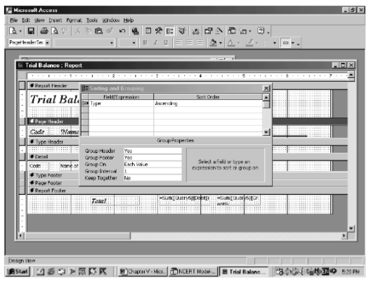 (i) Copy the trial balance design as created above and paste it with different name say “Trial balance with Grouping”. Open this copied report design for modification in design view to incorporate the grouping and sorting of accounts in trial balance report