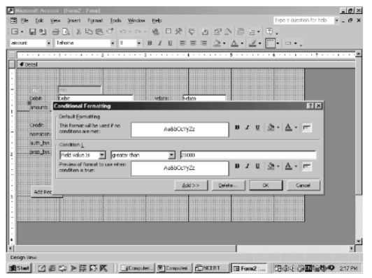 • Validation Rule and Text : Validation means checking of data to eliminate incorrect entries. Validation criteria can be specified for this property. If the data so entered does not satisfy the validation criteria, the validation text gets displayed.