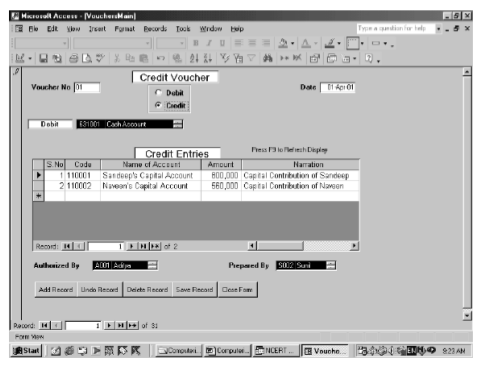 • Debit : This column is meant to store the code corresponding to an account, which has been debited in recording a transaction. Since it references the code column, which is the primary key of Accounts table as described above, it is a foreign key column in Vouchers table. The data type and properties of this column should be the same as that of code column of Accounts table, except that its Indexed property need be set to Yes Duplicates OK). The relationship between the code column of accounts table and debit column of Vouchers table must also be defined so as to maintain referential integrity.