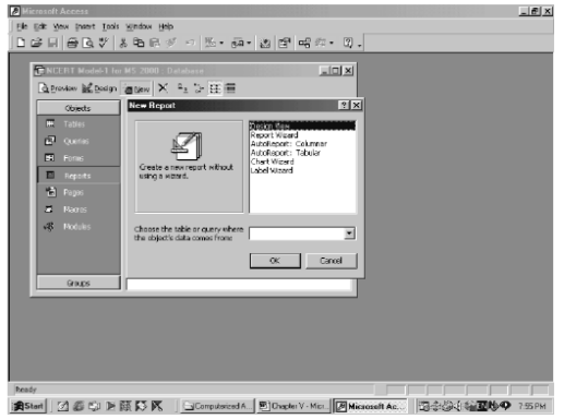 (i) Select Reports from objects list provided by LHS of Database Window and click at New object button of tool bar. Access responds by displaying the New Report Window as shown in figure 15.8 Choose Design View from list of methods and Query 05 from combo control meant to provide data source to the report. Click OK after choosing method and data source of report.