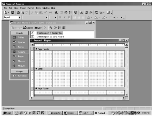 4. Designing Reports in Access : A report in Access may be designed in three ways: Auto Report, Wizard and Design View method. A SQL statement (or query) is capable of displaying records containing fields from across a number of data tables. A typical report in Access has the structure that consists of Report header, Page header, Group header, Details, Group footer, Page footer and Report footer.