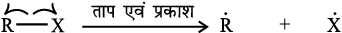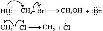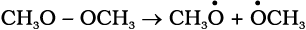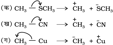 12.16 निम्नलिखित आबंध विदलनों के लिए इलेक्ट्रॉन-विस्थापन को मुड़े तीरों द्वारा दर्शाइए तथा प्रत्येक विदलन को समांश अथवा विषमांश में वर्गीकृत कीजिए। साथ ही निर्मित सक्रिय मध्यवर्ती उत्पादों में मुक्त-मूलक, कार्बधनायन तथा कार्बऋणायन पहचानिए–