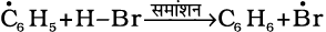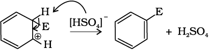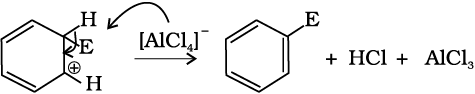 (ग) प्रोटॉन का विलोपन– एेरोमैटिक गुण को पुनः स्थापित करने के लिए σ संकुल sp3 संकरित कार्बन पर AlCl–4 (हैलोजनन, एेल्किलन तथा एेसिलन के संदर्भ में) अथवा HSO–4 (नाइट्रोकरण के संदर्भ में) के आक्रमण द्वारा प्रोटॉन का विलोपन करता है।