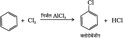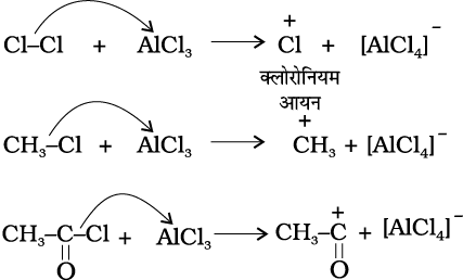 (क) इलेक्ट्रॉनस्नेही E+ की उत्पत्ति– बेन्जीन के क्लोरीनन, एेल्किलन तथा एेसिलन में निर्जल AlCl3, जो लूइस अम्ल है, आक्रमणकारी अभिकर्मक के साथ संयुक्त होकर क्रमशः Cl⊕, R⊕, RC⊕O (एेसीलियम आयन) देता है।