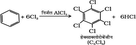 पराबैंगनी प्रकाश की उपस्थिति में तीन क्लोरीन अणु बेन्जीन वलय पर संयोजित होकर बेन्जीनहैक्साक्लोराइड C6H6Cl6 बनाते हैं, जिसे गैमेक्सीन भी कहते हैं।
