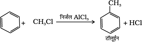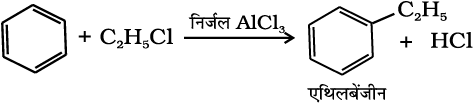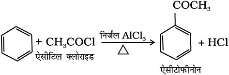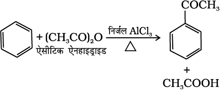 (v) फ्रीडेल-क्राफ्ट एेसिलीकरण या एेसीटिलन– लुइस अम्ल (AlCl3) की उपस्थिति में बेन्जीन की एेसिल हैलाइड अथवा एेसिड एेनहाइड्राइड के साथ अभिक्रिया करने पर एेसिल बेन्जीन प्राप्त होती है।
