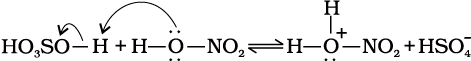 नाइट्रोकरण के संदर्भ में सल्फ्यूरिक अम्ल से नाइट्रिक अम्ल को प्रोटॉन के स्थानांतरण पर इलेक्ट्रॉनस्नेही नाइट्रोनियम आयन