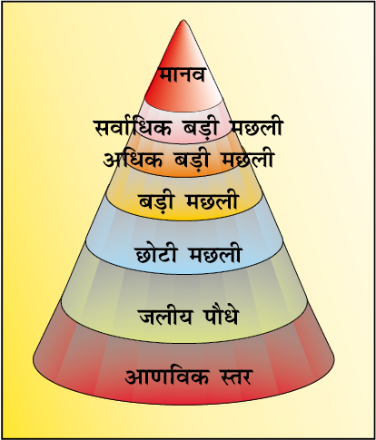 चित्र 14.3 प्रत्येक पोषी स्तर पर प्रदूषक दस गुना सांद्रित हो जाता है।