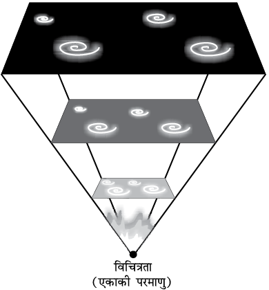- (i) आरम्भ में वे सभी पदार्थ, जिनसे ब्रह्मांड बना है, अति छोटे गोलक (एकाकी परमाणु) के रूप में एक हीस्थान पर स्थित थे। जिसका आयतन अत्यधिक सूक्ष्म एवं तापमान तथा घनत्व अनंत था।